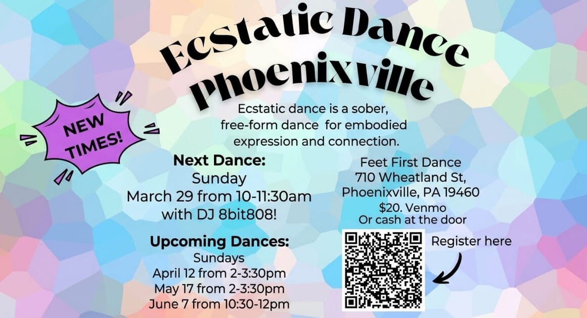Looking for a soulful way to kick off your Sunday? Ecstatic Dance Phoenixville returns March 29th at Feet First Dance. From 10:00 to 11:30 AM, join DJ 8bit808 for a sober, free form session designed for connection and expression. It’s all about moving how you feel! Entry is $20 via Venmo or cash at the door. Grab your spot today.